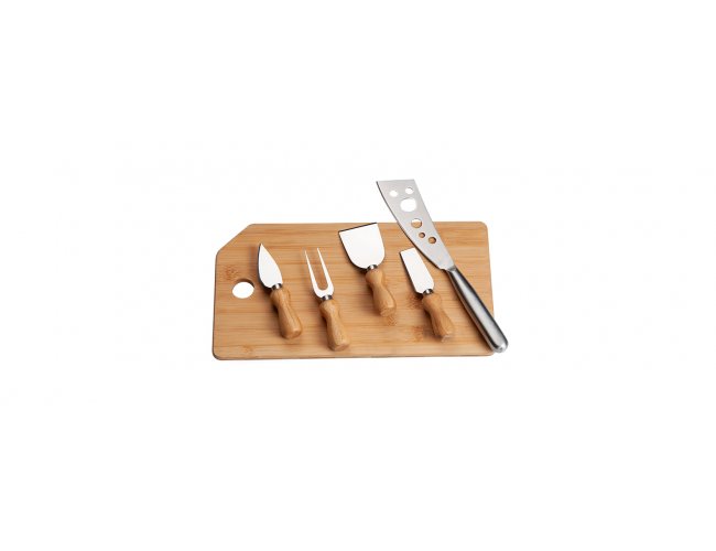 Conjunto para queijo em bambu/aço inox. Conta com tábua em bambu; Duas facas, sendo, uma com ponta e outra reta, garfo e espátula em madeira/inox; Faca para frios em metal. Acompanha embalagem kraft
