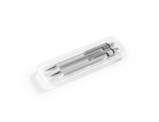 Conjunto de esferográfica e lapiseira em Alumínio. Esferográfica: 1,5km de escrita e está Incluso estojo. Dimensões: 11 x 137 mm | Estojo: 165 x 50 x 24 mm.