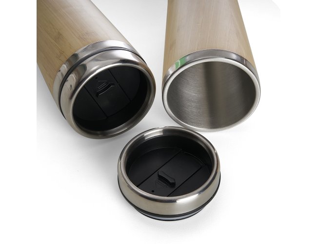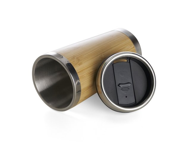 Copo Bambu de 500ml, parte interna em inox. Possui tampa com compartimento que pode ser aberto para beber.