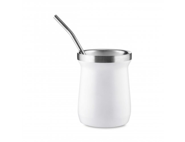 Copo/Cuia térmico de 250 ml, produzido em inox interno 304 e externo 201, acompanhado de Mini Bomba (17,5cm) em inox.
