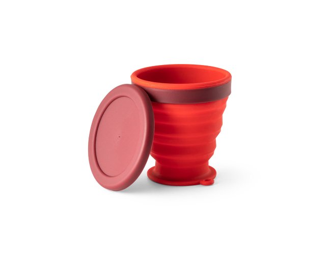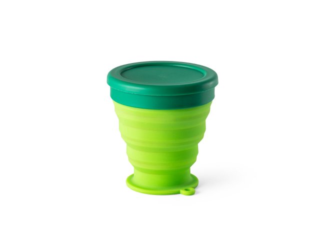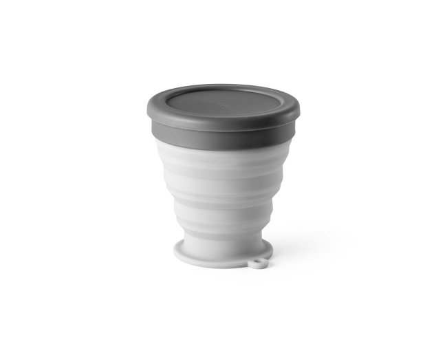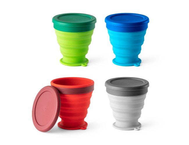 Copo de viagem dobrável em silicone com tampa em PP. Contém uma argola na base que serve como pega ou para pendurar. Copo com capacidade até 240 ml.