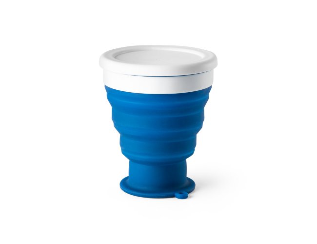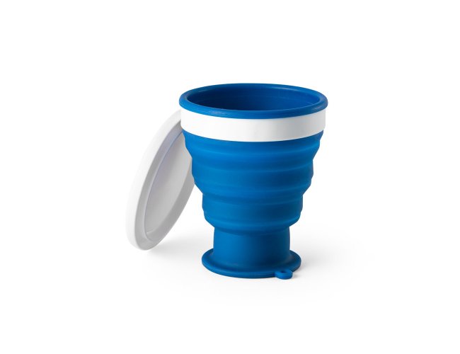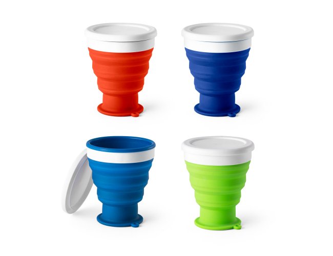 Copo de viagem dobrável em silicone com tampa em PP. Contém uma argola na base que serve como pega ou para pendurar.