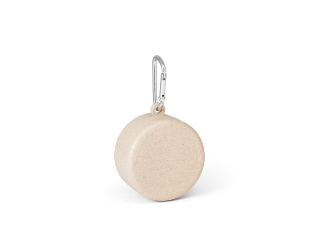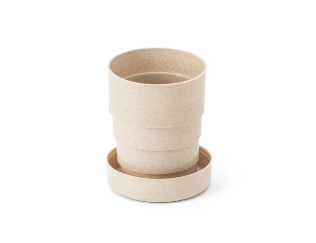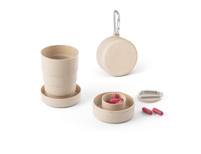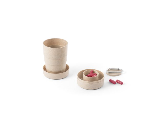 Copo de viagem retrátil em fibra de bambu (50%) e PP (50%) com capacidade até 210 ml. Incluso caixa para comprimidos e mosquetão.
