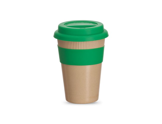 Copo em fibra de bambu com pegador e tampa em silicone, capacidade 450ml.
