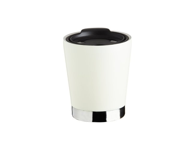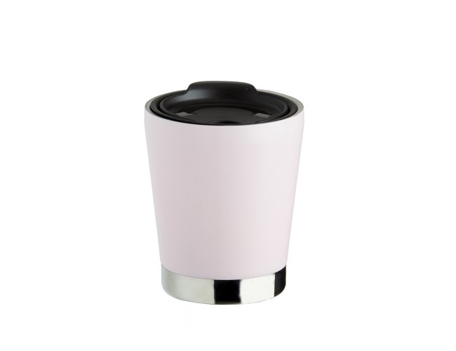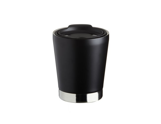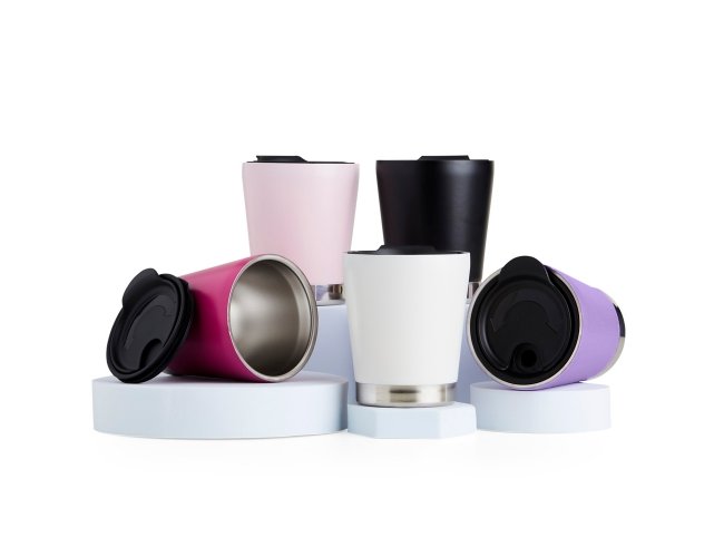 Copo de parede dupla em inox 304 com capacidade de 300ml, possui tampa plástica de encaixe com acesso ao bocal e área para canudo (não acompanha).