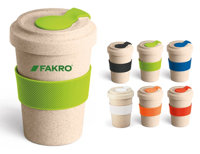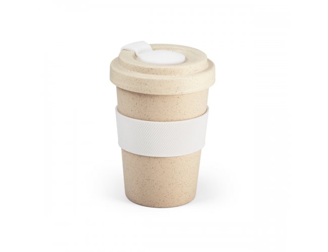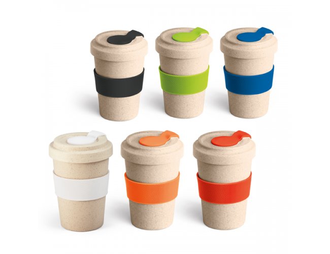 Copo para viagem. Fibra de bambu e PP. Com banda de silicone e tampa. Capacidade até 500 ml.