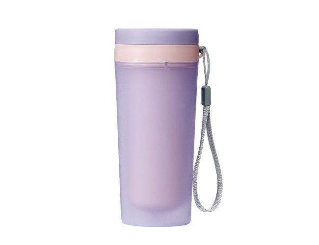 Copo de plástico polipropileno com capacidade para 350ml livre BPA, parede dupla. Acompanha tampa rosqueável e alça de nylon para transporte.