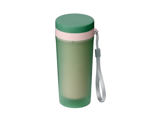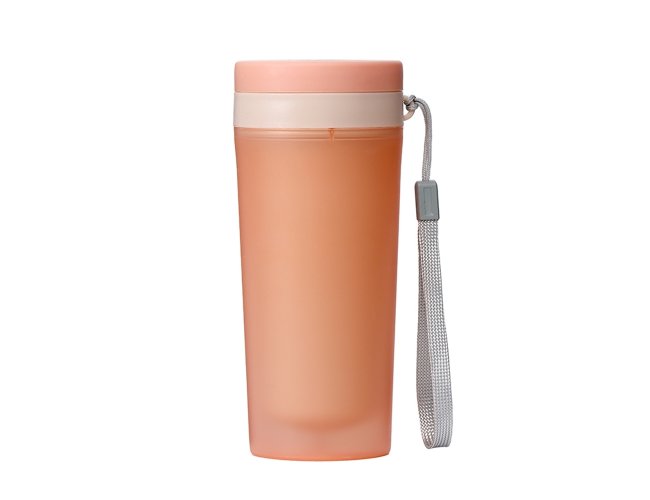 Copo de plástico polipropileno com capacidade para 350ml livre BPA, parede dupla. Acompanha tampa rosqueável e alça de nylon para transporte.