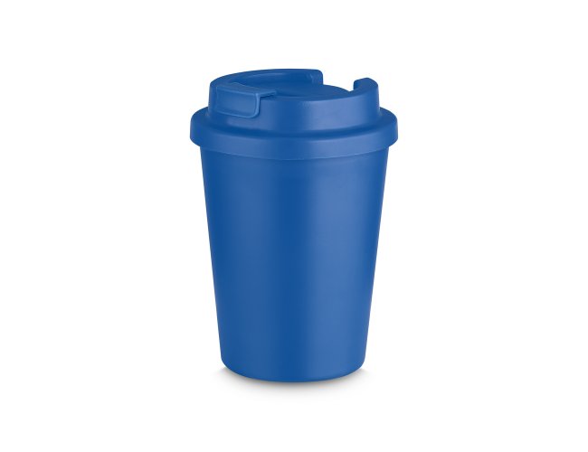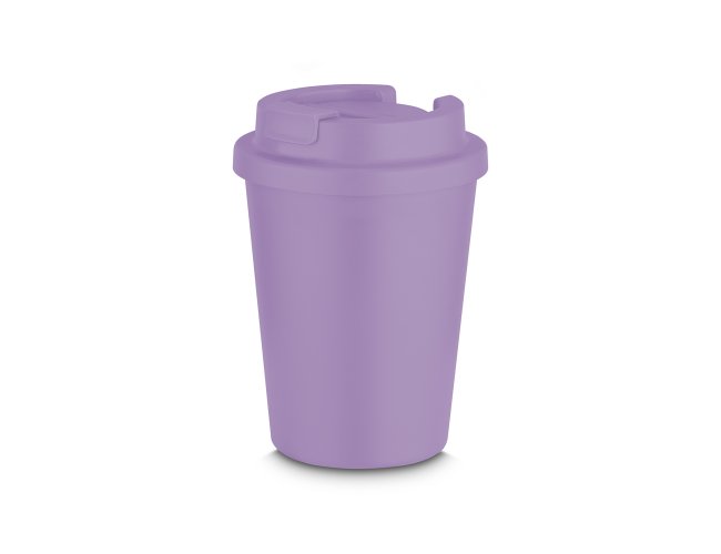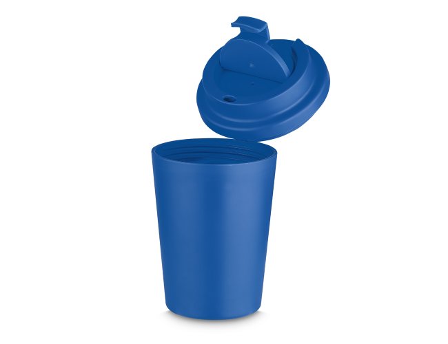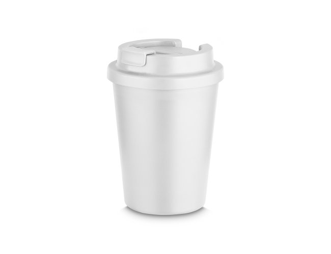 Copo plástico produzido em Plástico RPET, permitindo ir ao microondas, com capacidade de 400ml, tampa rosqueável.