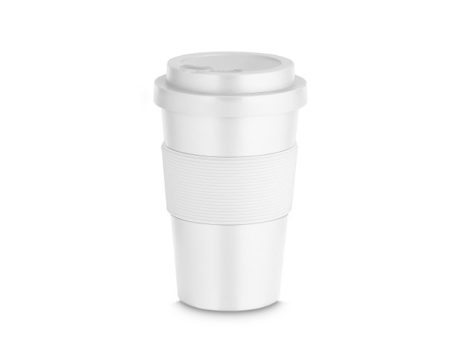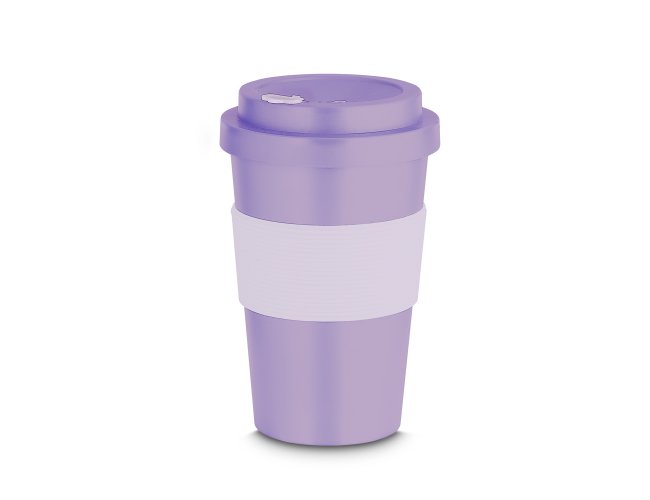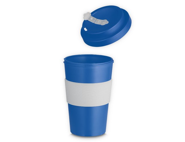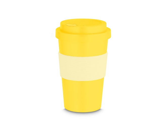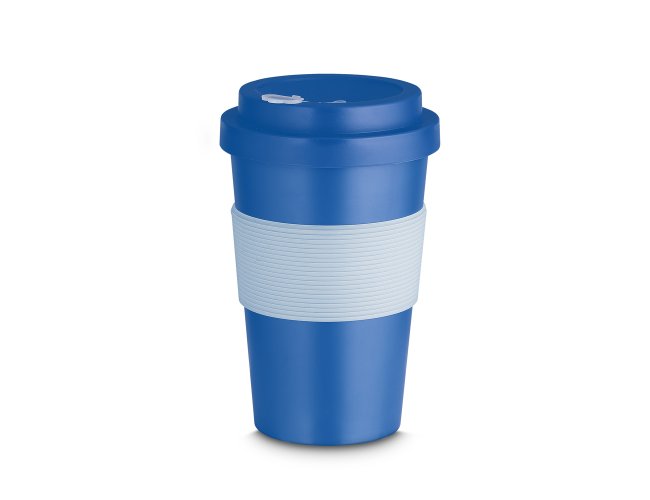 Copo produzido com Plástico RPET, com capacidade de 400ml, tampa rosqueável e detalhe em silicone.