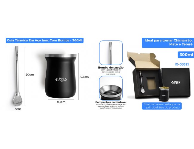 Cuia Térmica Em Aço Inox Com Bomba - Preto - 300Ml IG-03321
