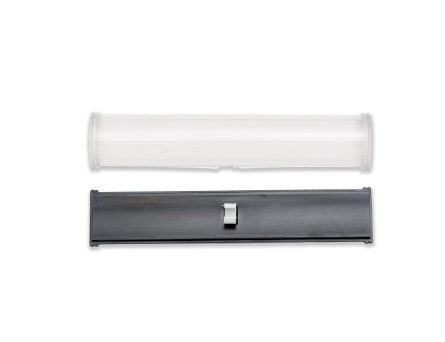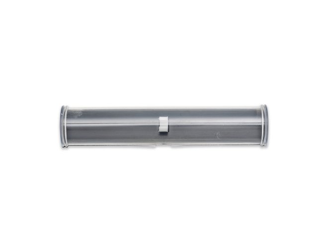 Estojo de acrílico para uma caneta formato meia lua. Verso plástico preto com suporte branco interno para fixar caneta. Tamanho total aproximado (CxD): 16,3 cm x 3,4 cm. Peso aproximado (g): 21