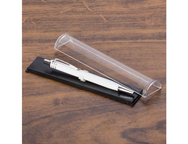 Estojo de acrílico para uma caneta formato meia lua. Verso plástico preto com suporte branco interno para fixar caneta.