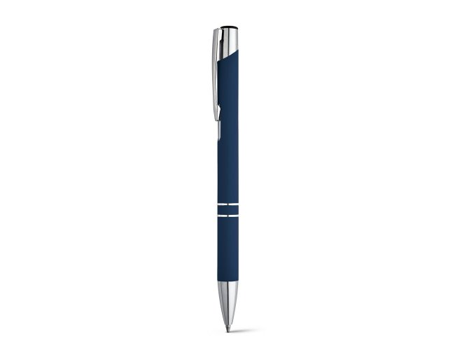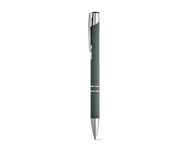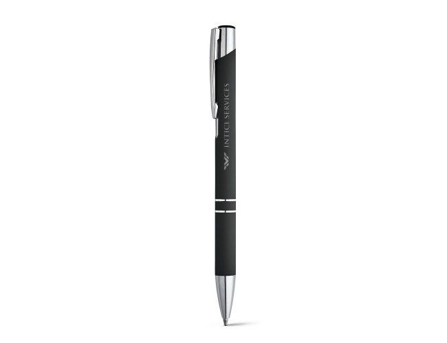 Esferográfica em alumínio e acabamento emborrachado. Até 1,5 km de escrita. ø10 x 137 mm