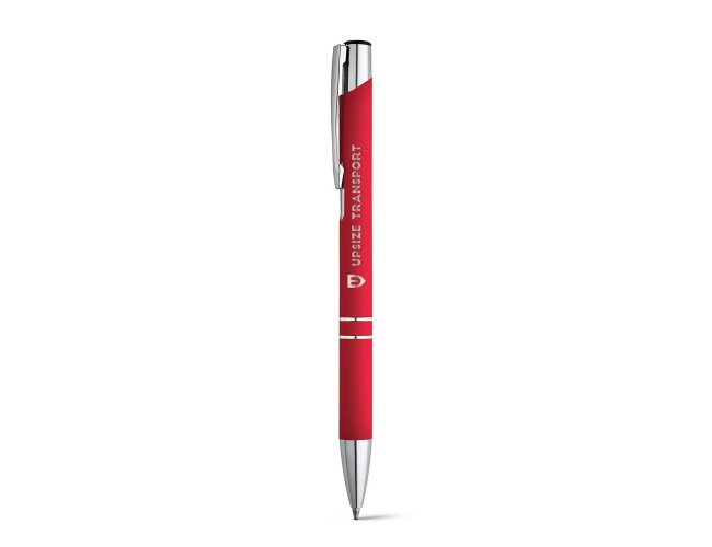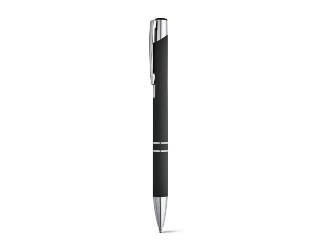 Esferográfica em alumínio e acabamento emborrachado. Até 1,5 km de escrita. ø10 x 137 mm
