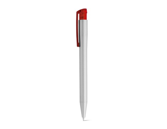 Esferográfica em ABS com acabamento metalizado e clipe translúcido colorido. Até 1,5 km de escrita. ø11 x 136 mm