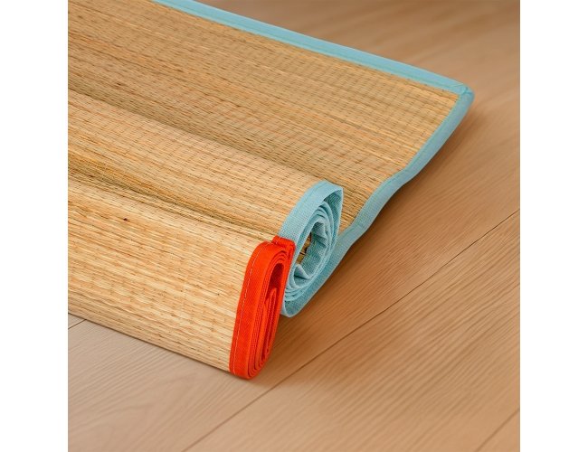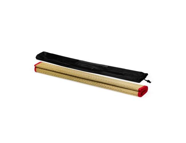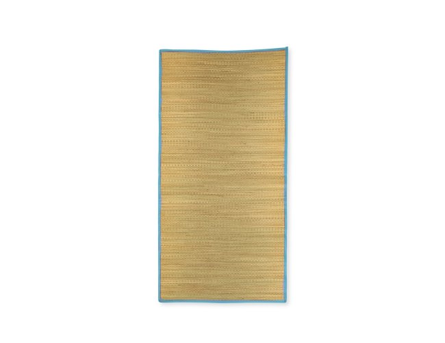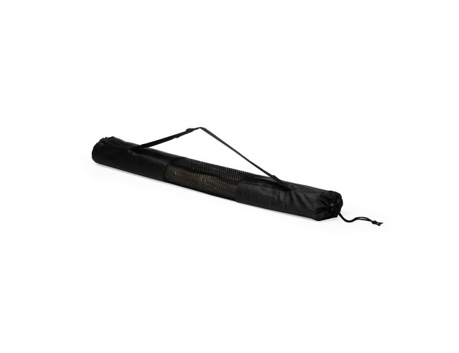 Esteira leve feita em palha natural com bordas costuradas em nylon. Acompanha saco de nylon com seção telada, cordão de fechamento e alça regulável para transporte.