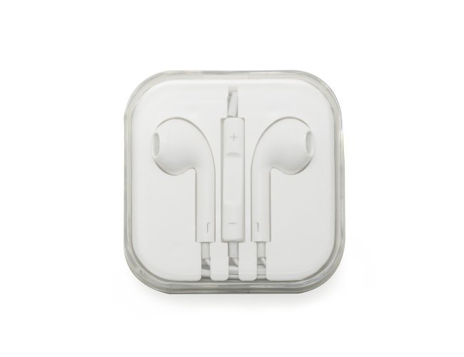 Fone de ouvido estéreo com microfone e controle de volume. Fone de ouvido plástico na cor branca, entrada P2, possui indicativo L(left) e R(right) na área interna do fone, detalhes internos vazados no fone(possibilita a visão da tela de proteção), microfone acoplado no suporte com desenho indicativo e no verso do suporte controle de volume com desenho indicativo – e +. Acompanha embalagem plástica branca com tampa acrílica transparente. OBS.: Botões de volumes funcionam apenas em aparelhos da linha APPLE.