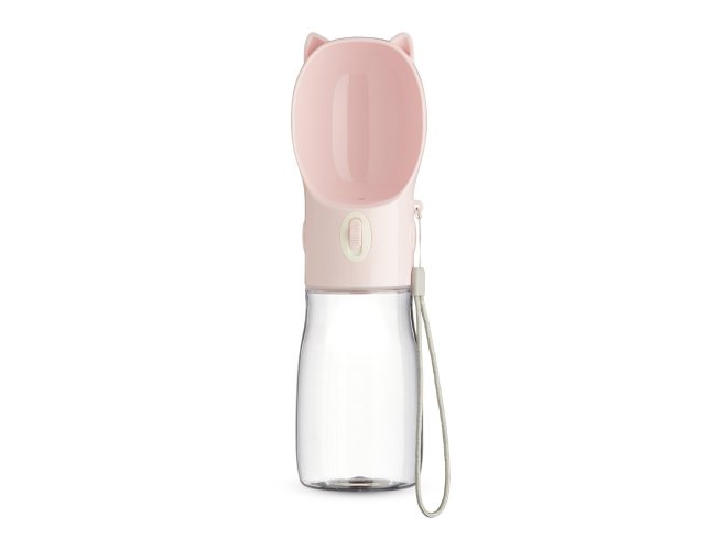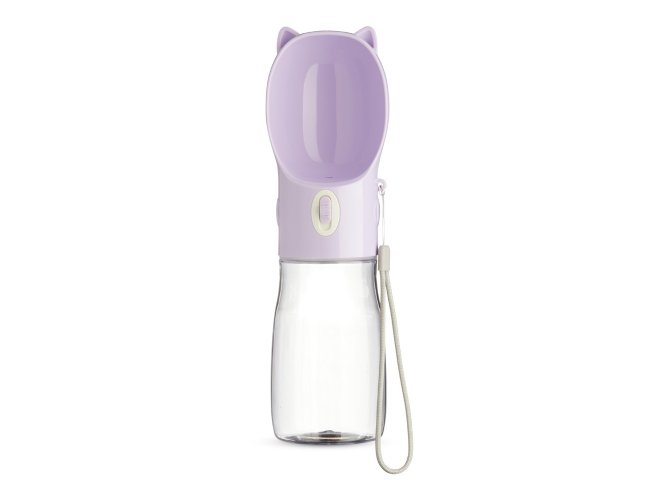 Garrafa bebedouro para pet feita em plástico com capacidade de 420ml. Basta acionar o botão para liberar o fluxo da água através da tigela. Acompanha alça de nylon para transporte.
