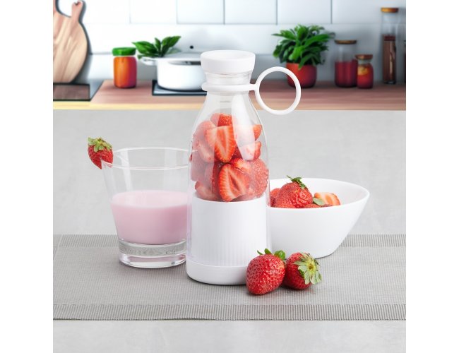 Mini liquidificador portátil com capacidade de 380ml. Contém tampa rosqueável plástica com alça emborrachada para transporte, ventoinha inox 6 lâminas e base plástica com borrachas antiderrapantes. Acompanha cabo USB. Obs. (Para o funcionamento do produto a quantidade total de frutas/água adicionadas não deve exceder 300ml).