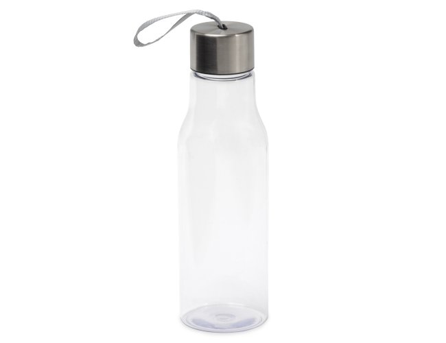 Garrafa plástica 600ml com tampa de alumínio e alça de nylon embutida.