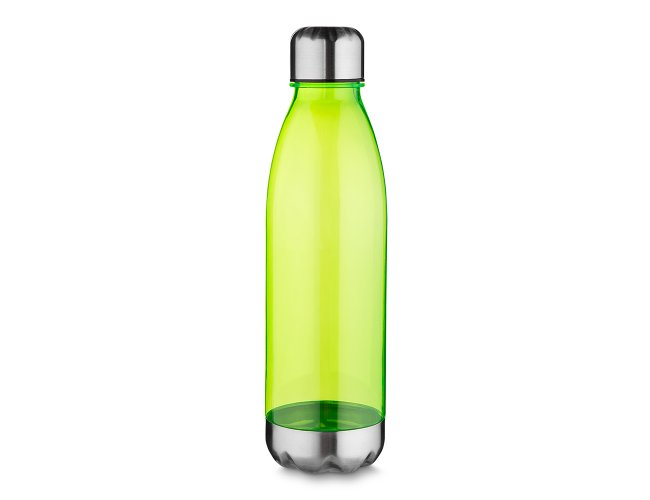 Garrafa plástica com capacidade de até 700 ml. Tampa rosqueável com anel de silicone para vedação, base em metal. Plástico Utilizado PC (Policarbonato)