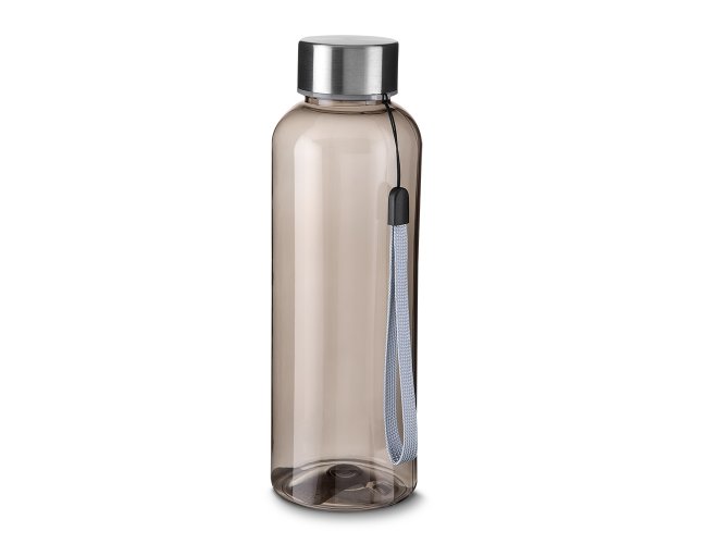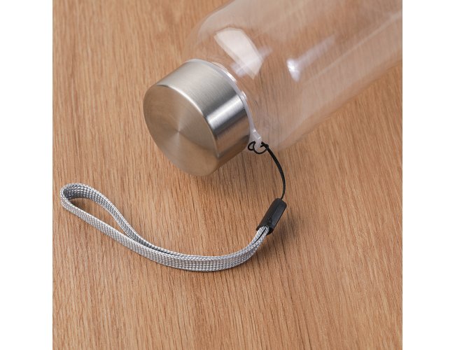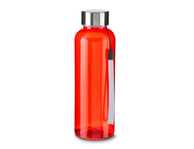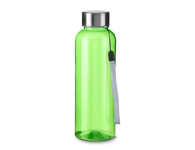 Garrafa *RPET com capacidade de até 600ml. Alça de transporte em cordão e tampa rosqueável de metal.