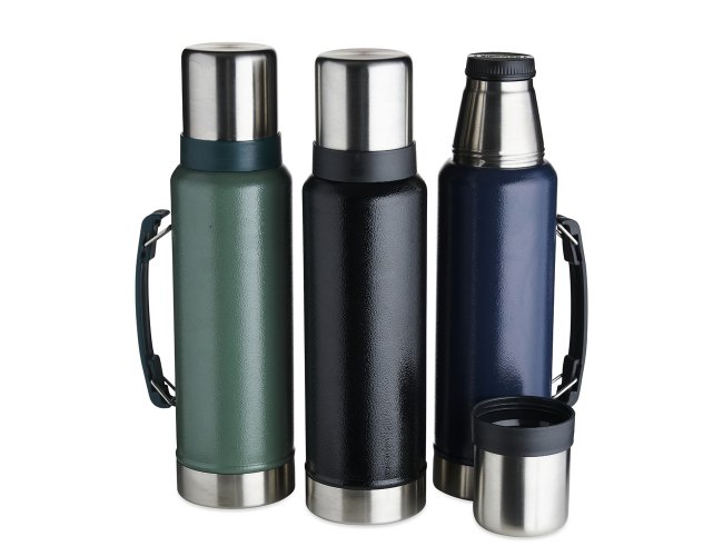 Descrição: Garrafa térmica de inox livre de BPA com capacidade de 1,4 litro. Contém alça para transporte e pintura texturizada.