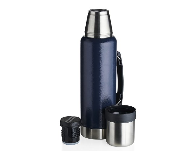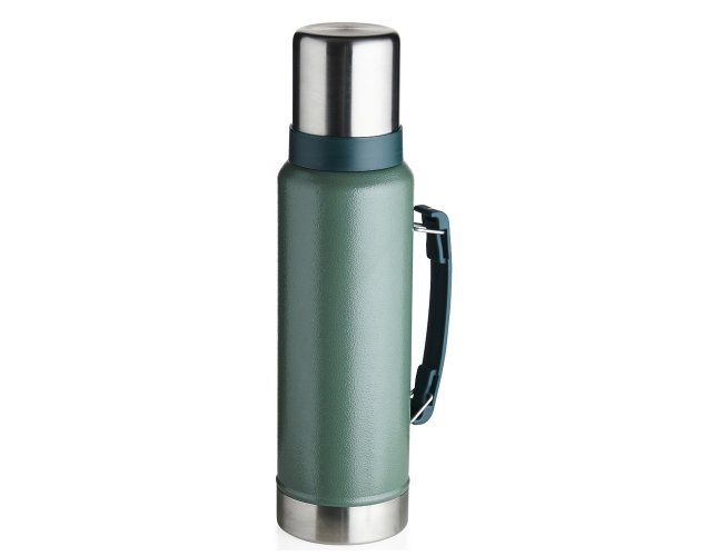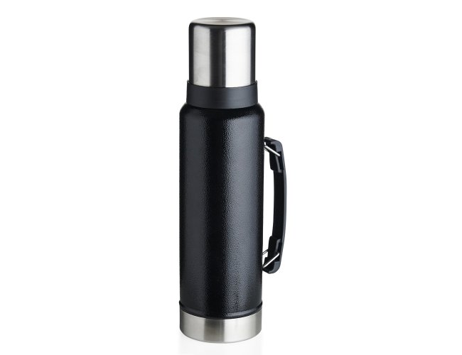 Garrafa térmica de inox livre de BPA com capacidade de 1,4 litro. Contém alça para transporte e pintura texturizada