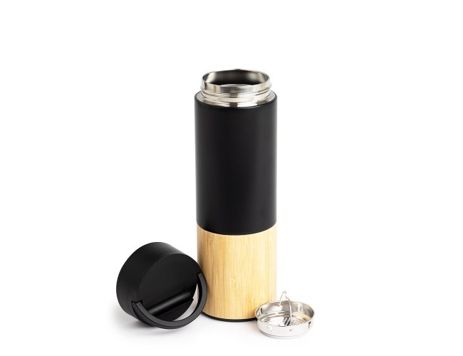Garrafa térmica produzida em inox 304 com capacidade de 420ml, acompanha peneira para infusão de bebidas. Com detalhes em bambu e plástico, sua tampa é livre de BPA e possui uma alça para transporte que também pode ser utilizada como suporte para celular.