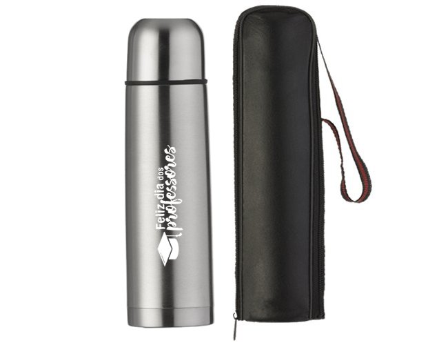 Garrafa Térmica 500ml 1116 em inox com tampa rosqueável, tampa interna em plástico resistente(basta um clique para abrir ou fechar). Acompanha capa protetora de couro sintético com alça de nylon.