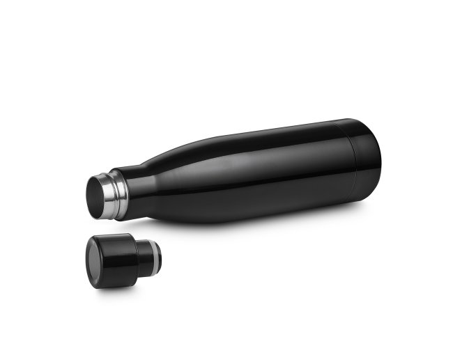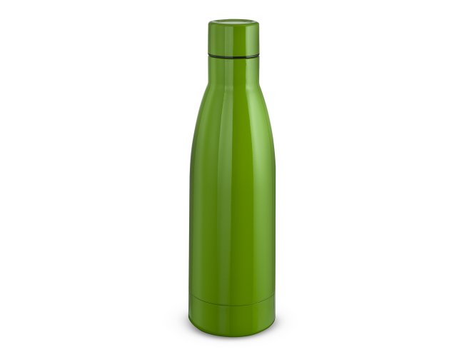 Garrafa térmica em aço inox com parede dupla isoladao à vácuo, com tampa de inox na cor do produto e anel de silicone para vedação. Capacidadede até 400ml, pintura brilhosa.