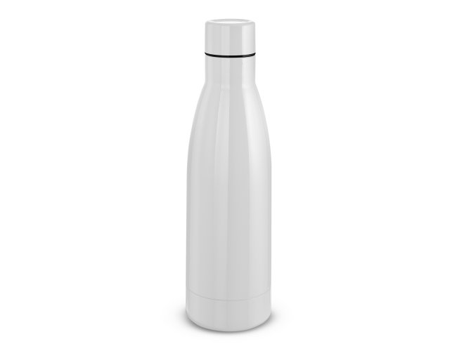 Garrafa térmica em aço inox com parede dupla isoladao à vácuo, com tampa de inox na cor do produto e anel de silicone para vedação. Capacidadede até 400ml, pintura brilhosa.