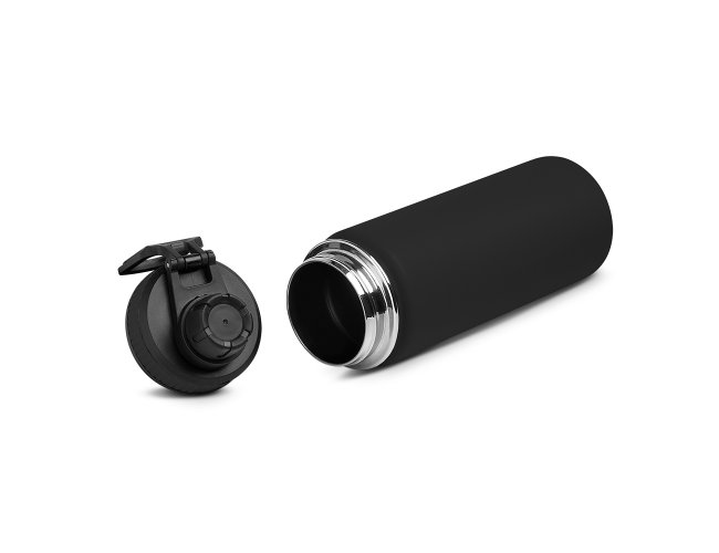 Garrafa térmica em aço inox com parede dupla com capacidade de até 570 ml. Tampa rosqueável, alça em plástico e anel de silicone para vedação. Design com frisos na tampa e pintura pó.