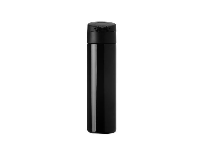 Garrafa térmica em inox 304 com parede dupla, capacidade de 450ml. Tampa com botão de acionamento e trava de segurança.