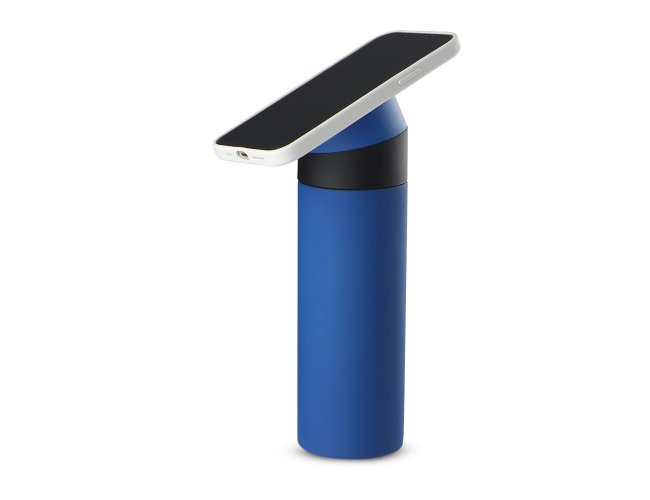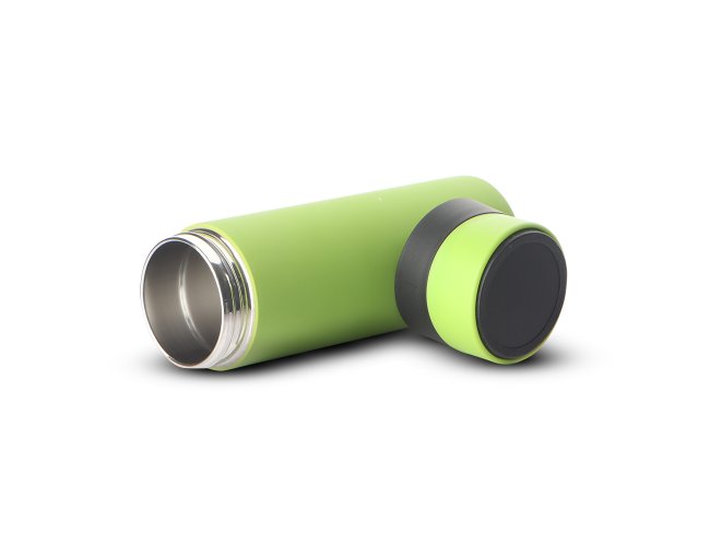 Garrafa térmica em aço inox com parede dupla isolada a vácuo, com capacidade de até 400 ml. Tampa rosqueável com anel de silicone para vedação. Com apoio de silicone para o celular na tampa.