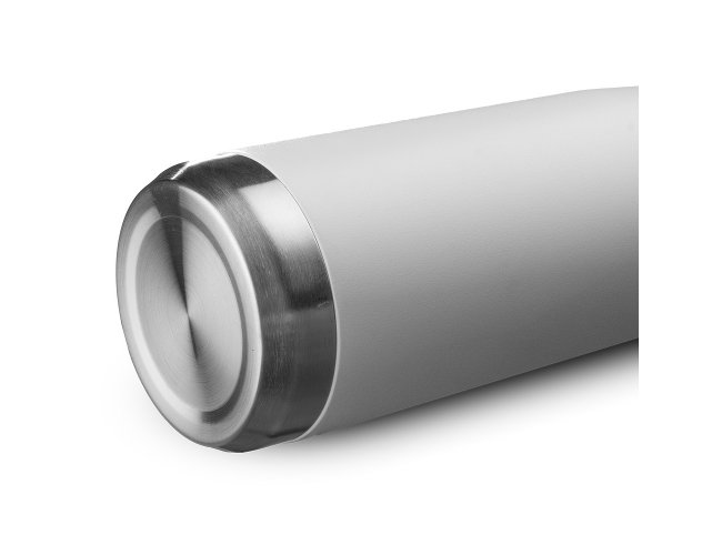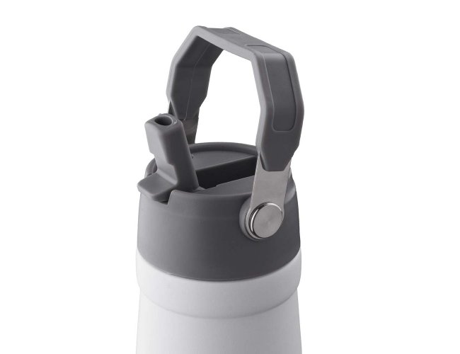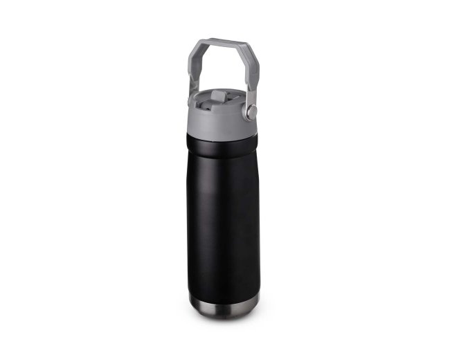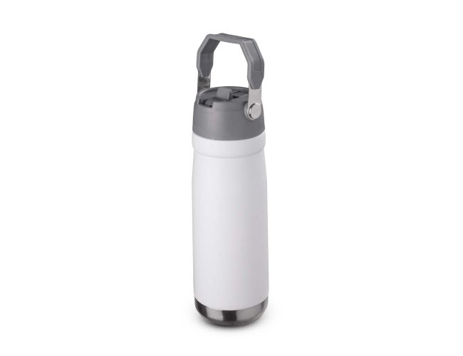 Garrafa térmica em aço inox com parede dupla, com capacidade de 700ml. Tampa rosqueável em plástico, com alça plástica para transporte. Bico por meio de sucção com canudo.