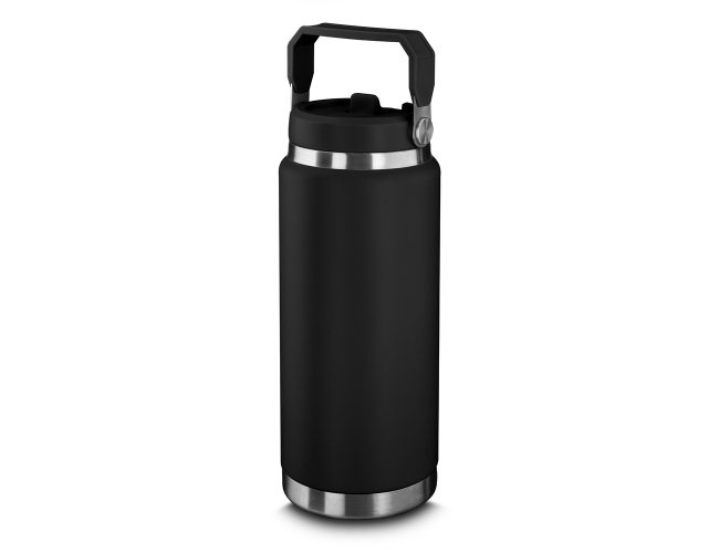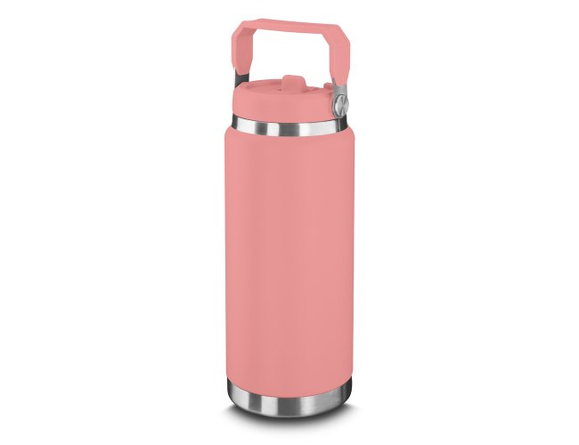 Garrafa térmica em aço inox com parede dupla com capacidade de até 900ml. Tampa rosqueável com anel de silicone para vedação. Alça de transporte em plástico. Permite-se hidratar pelo bico, com canudo. Pintura a pó.