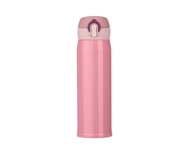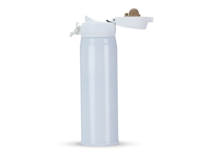 Garrafa térmica de 400ml de inox colorida com botão e válvula para abertura. Possui um sistema de trava (basta mover para cima/baixo para abrir/fechar), pressione o botão central para abrir a tampa(possui na parte interna borracha protetora evitando vazar o líquido). Para abrir a tampa por completo basta rosqueá-la, parte interna revestida em inox. Na embalagem do produto pode ir especificado a capacidade de 450ml ou 500ml devido aos fabricantes que trabalham terem impresso a descrição deste modo, porém ressalvamos a capacidade correta de 400ml.