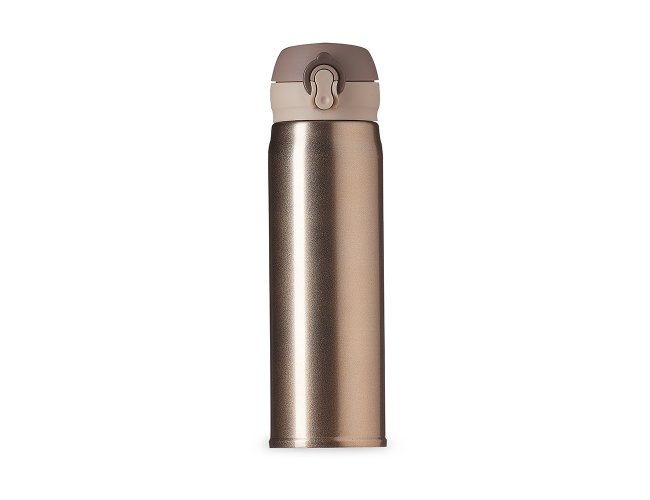 Garrafa térmica de 400ml de inox colorida com botão e válvula para abertura. Possui um sistema de trava (basta mover para cima/baixo para abrir/fechar)