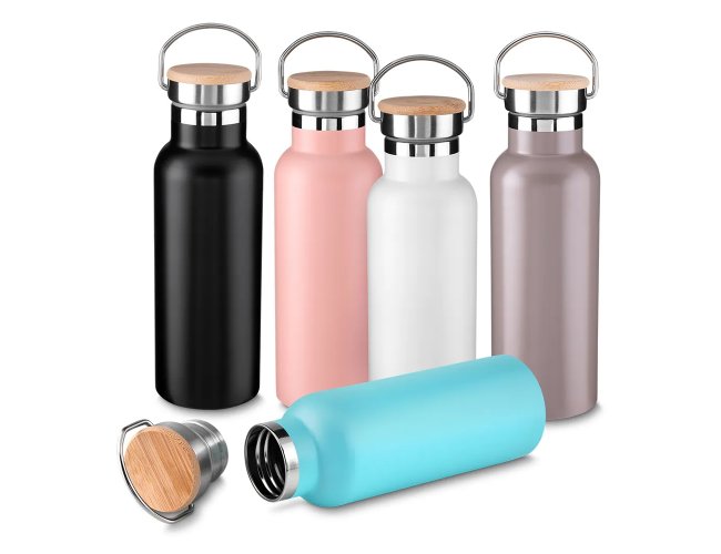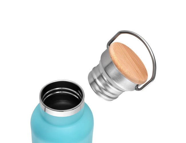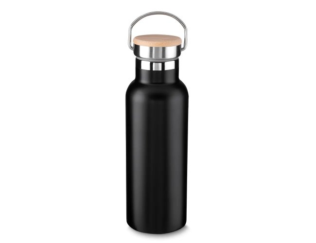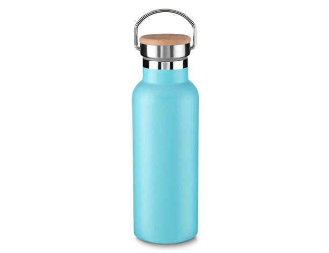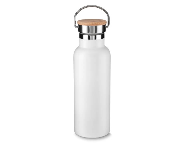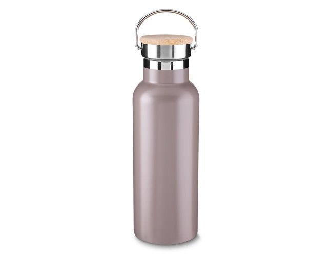 Garrafa térmica em inox 500 ml, tampa rosqueável com revestimento em fibra de bambu, alça de metal.