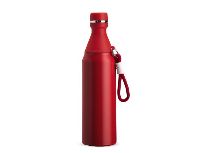 Garrafa térmica em inox com capacidade para até 500ml. Possui estrutura de parede dupla, ideal para conservar a temperatura de líquidos por mais tempo. Conta com tampa rosqueável e compartimento removível em plástico, permitindo o uso como copo. Acompanha alça em nylon com detalhes em plástico e mosquetão metálico.