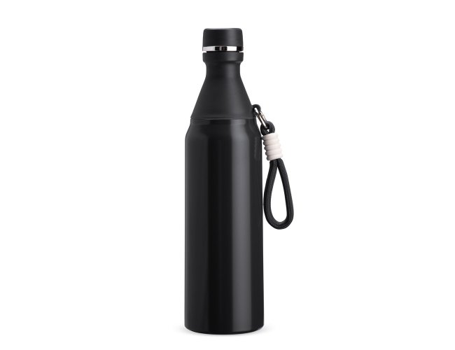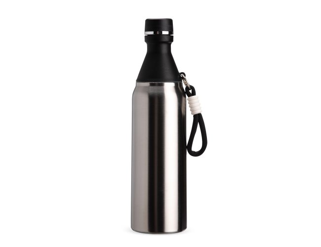 Garrafa térmica em inox com capacidade para até 500ml. Possui estrutura de parede dupla, ideal para conservar a temperatura de líquidos por mais tempo. Conta com tampa rosqueável e compartimento removível em plástico, permitindo o uso como copo. Acompanha alça em nylon com detalhes em plástico e mosquetão metálico.