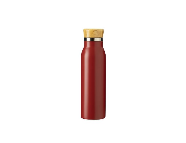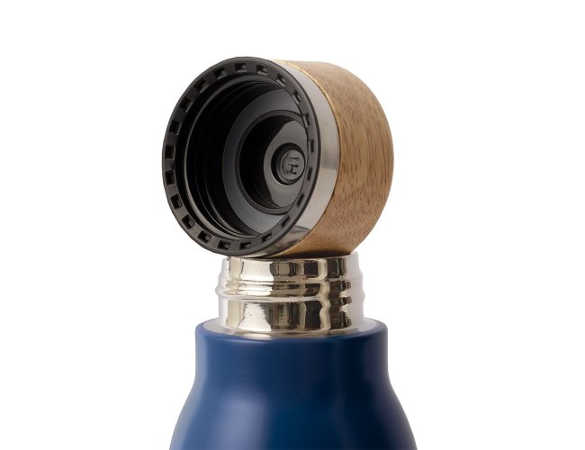 Garrafa térmica feita em inox com pintura em spray, tampa rosqueável em bambu e capacidade máxima de 600ml. Possui estrutura de parede dupla e isolamento a vácuo, permitindo manter a temperatura de líquidos por mais tempo.