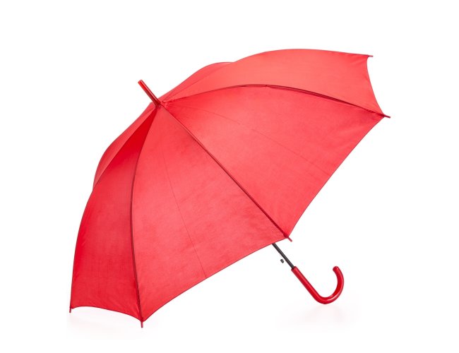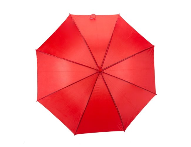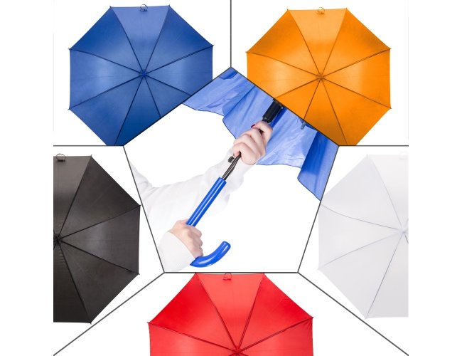Guarda-chuva com tecido de nylon e abertura automática, basta acionar o botão inferior. Possui 8 varetas pretas de aço, pegador e bico superior de plástico.