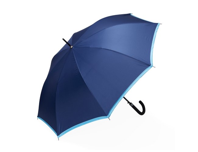 Guarda-chuva de poliéster de impacto impermeável com abertura automática, estrutura em aço e 8 varetas em fibra de vidro. Possui pegador plástico com botão de acionamento.