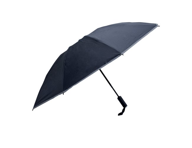 Guarda-chuva automático de poliéster de impacto impermeável com bordas refletivas, possui estrutura em aço e 10 varetas em fibra de vidro. Possui pegador plástico com botão acionamento e alça de nylon para transporte. Acompanha capa de proteção.