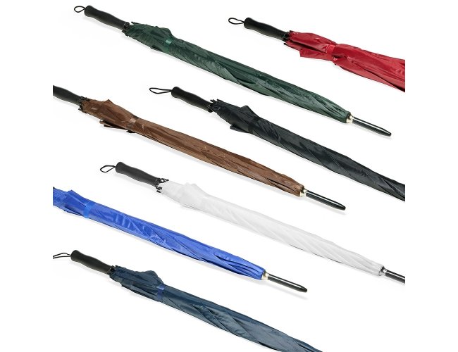 Guarda-chuva em poliéster com abertura automática, estrutura metálica com oito varetas e pegador em plástico com alça de nylon fixa na extremidade.