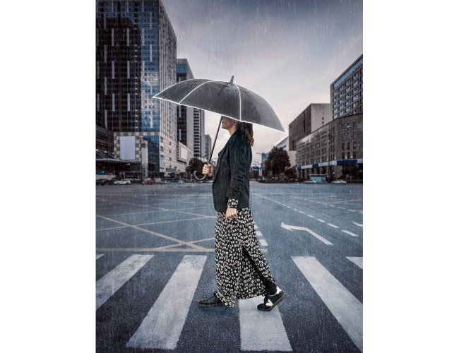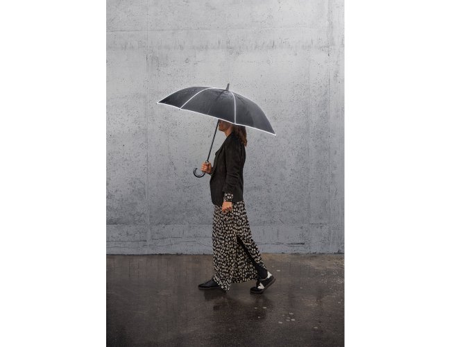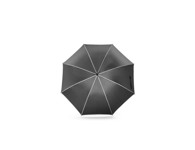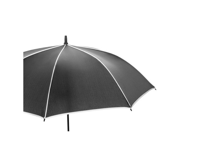 Guarda-chuva de 27" em poliéster 100% reciclado (rPET) pongee 190T, com varetas e haste em fibra de vidro. Guarda-chuva com abertura automática e à prova de vento, permitindo-o ser resistente em qualquer eventualidade. Possui detalhes refletivos em torno do guarda-chuva. Fornecido numa bolsa individual. ø1200 x 940 mm | Bolsa: ø87 x 756 mm