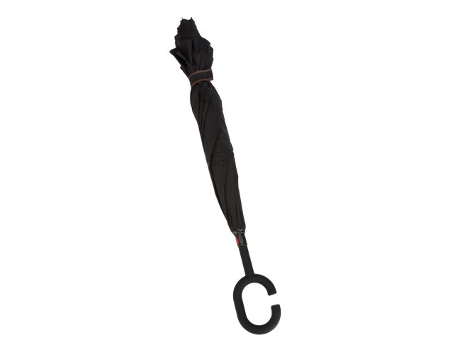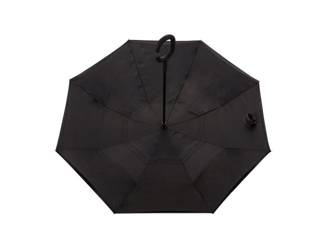 Guarda-chuva invertido com forro interno Personalizado com a sua logomarca. Tecido de nylon impermeável preto, possui um mecanismo inovador permitindo que o usuário não se molhe ao entrar e sair de ambientes devido sua abertura invertida, quando feito o movimento para fechar as varetas inverterão para cima criando um formato circular impedindo a chuva de atingir o usuário, podendo “segurar” a chuva enquanto entra/sai de um ambiente e depois virando o guarda-chuva irá escorrer a água. Forro interno para preservação das 8 varetas, evitando contato com a água e assim prolongando seu tempo de uso sem enferrujar. Ao impulsionar o fechamento invertido fica mais rápido e prático o modo de secar e ser guardado, pode ser apoiado no chão que permanecerá em pé para escorrer a água. Pegador plástico fosco em formato C, botão acionador vermelho e fita com velcro(contorno marrom) para lacre.